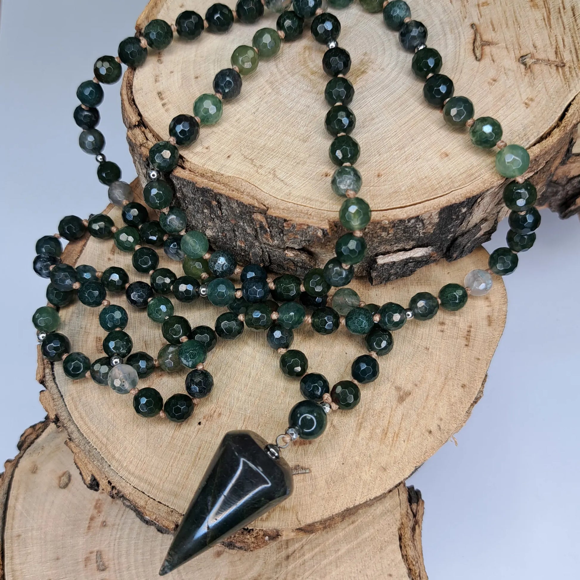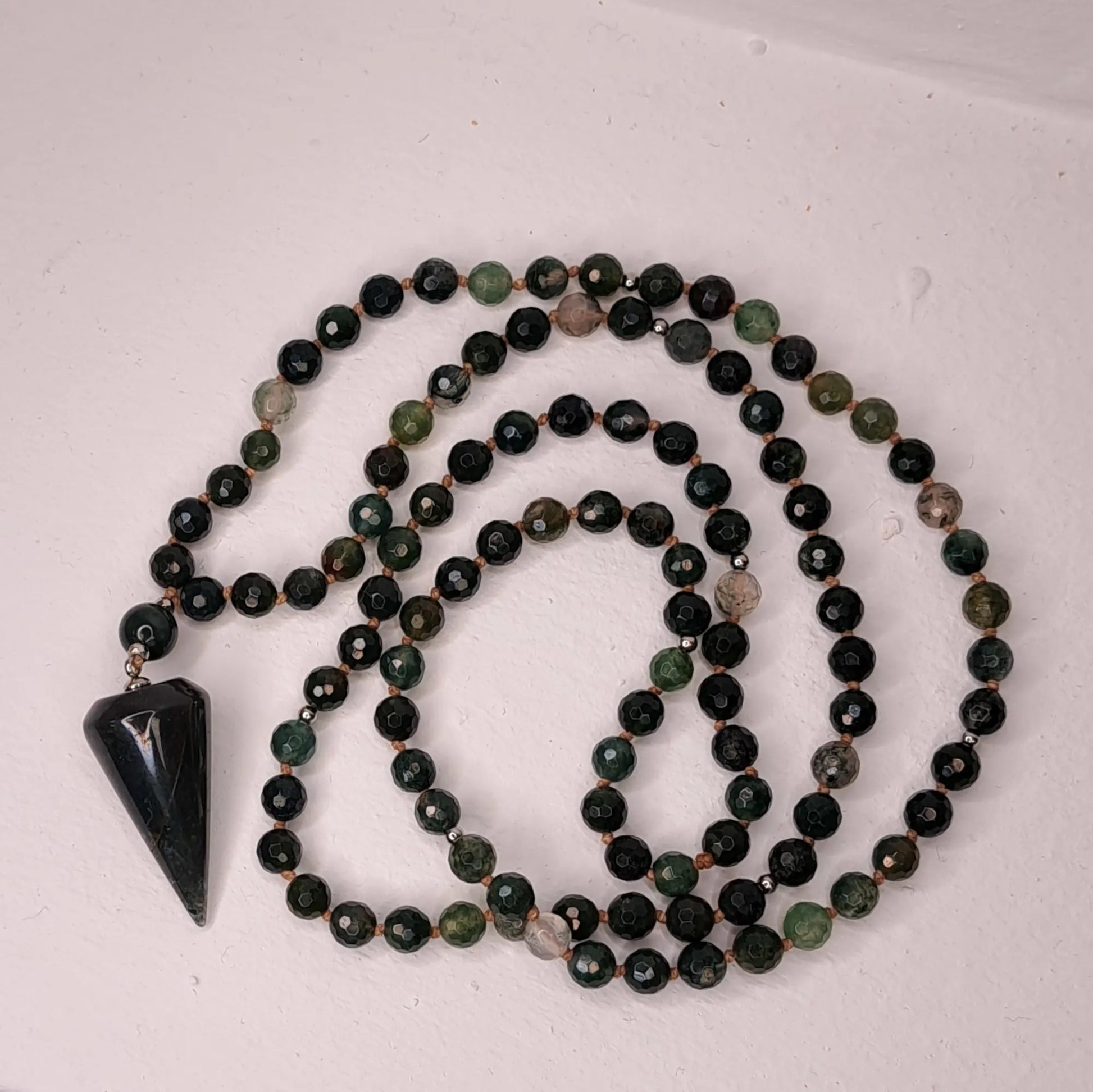 Handgeknüpfte Mala aus Moosachat, 108 Perlen, mit Kegel