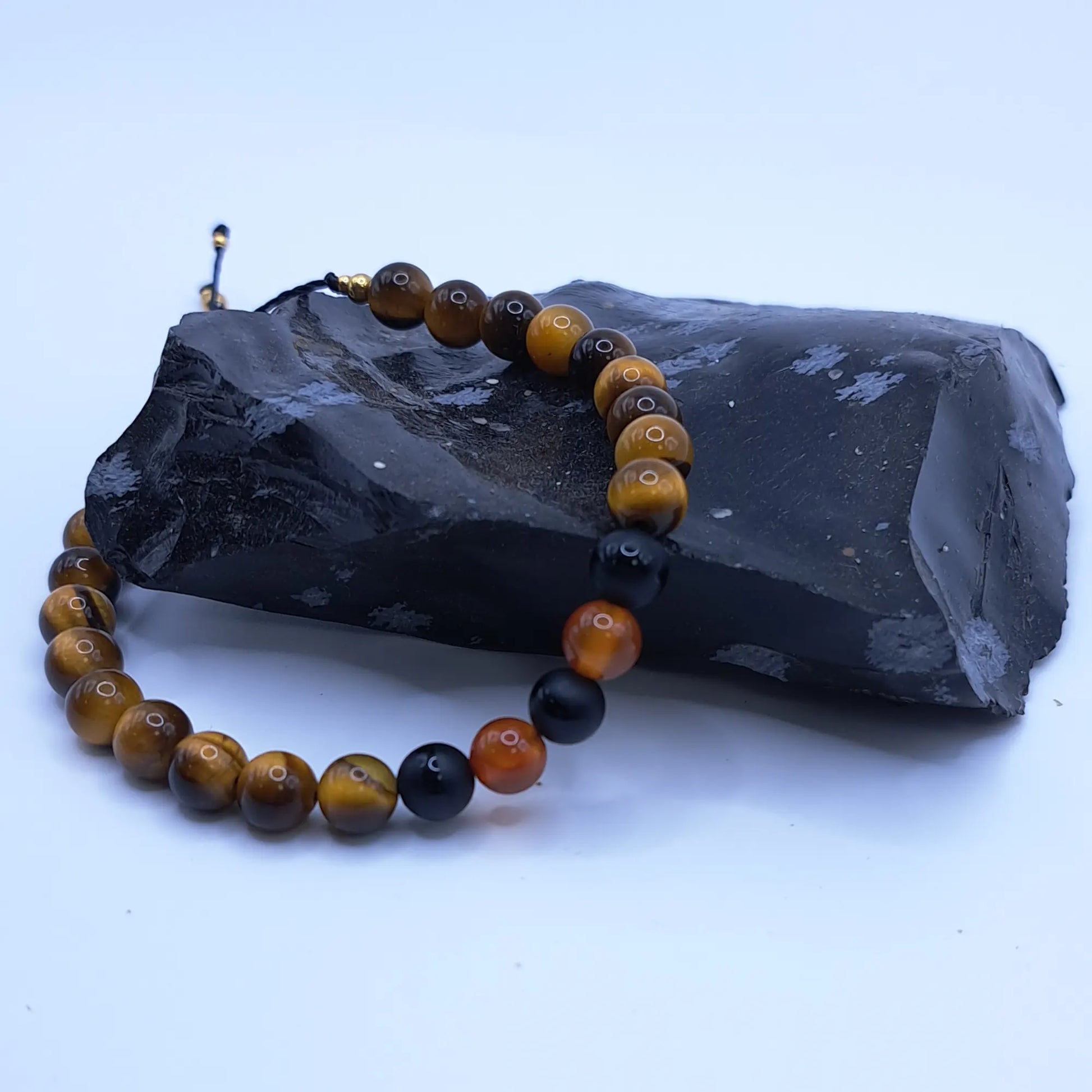 Handgeknüpftes Perlenarmband aus Tigerauge, Onyx & Karneol